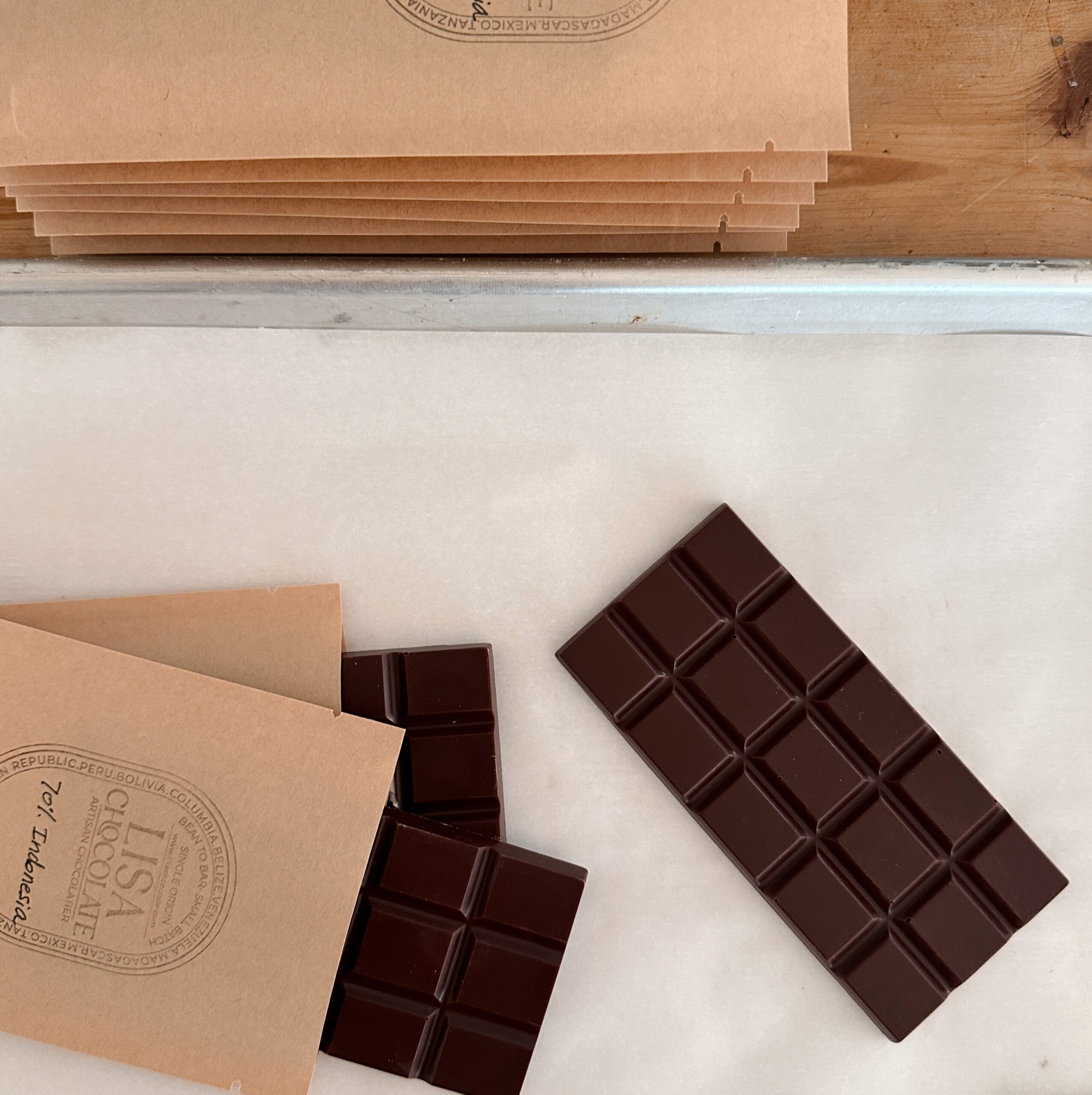 Our chocolate is crafted with cacao beans from the Anamalai Estate in Tamil Nadu, India. The beans are carefully roasted in our small roaster, winnowed to remove the shells, ground into a smooth paste, hand-tempered for a perfect finish, and molded into bars to bring out their unique flavor.